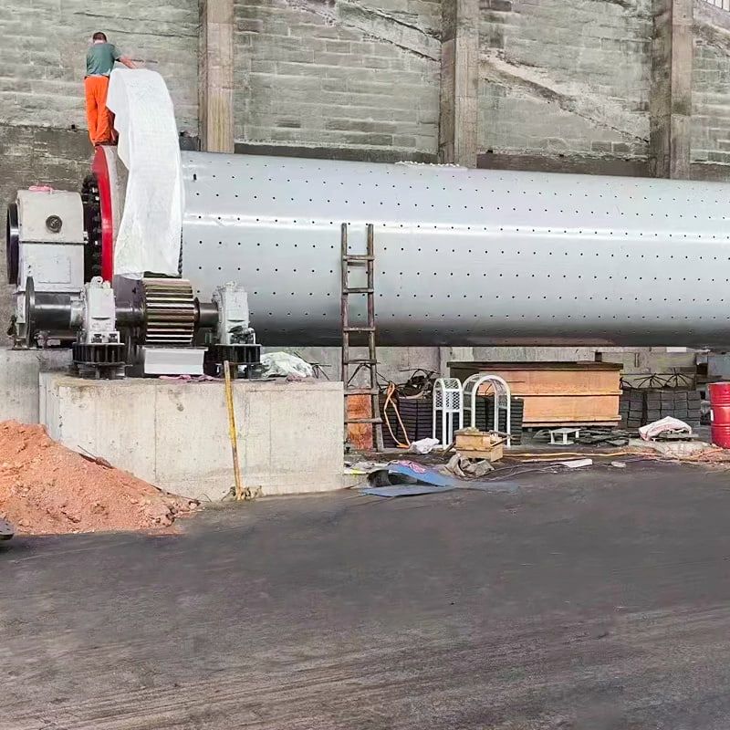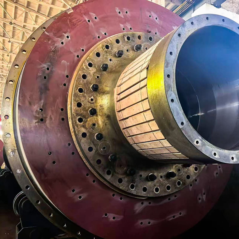 El material ingresa al cilindro a través de las secciones de alimentación y entrada. Los medios de molienda (bolas de acero/bolas de cerámica) en el cilindro giran con el material, generando fuerza centrífuga. Cuando el medio se eleva a cierta altura, cae debido a la gravedad. El impacto y la abrasión de los medios de molienda sobre el material lo pulverizan. Luego, el material pulverizado se descarga a través del puerto de descarga, impulsado por el agua de alimentación y lavado, completando el proceso de molienda. El molino de bolas consta de una sección de alimentación, una sección de descarga, una sección giratoria y una sección de transmisión (reductor, engranaje de transmisión pequeño, motor y control electrónico). El eje hueco es de acero fundido con un revestimiento interior extraíble. El gran engranaje giratorio está tallado a partir de una pieza fundida. El cilindro está revestido con un revestimiento resistente al desgaste para una excelente resistencia al desgaste. Esta máquina funciona de forma fluida y fiable.